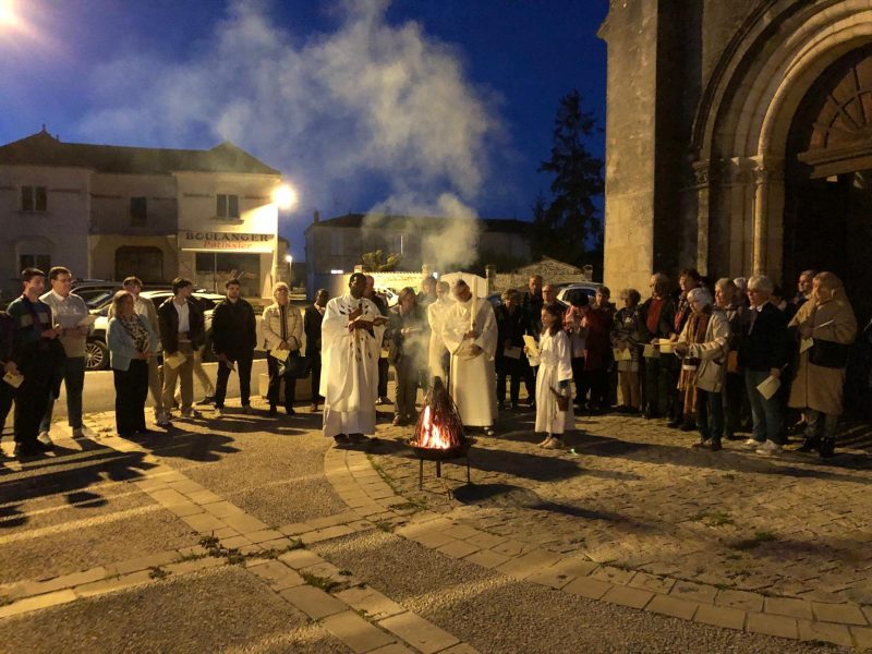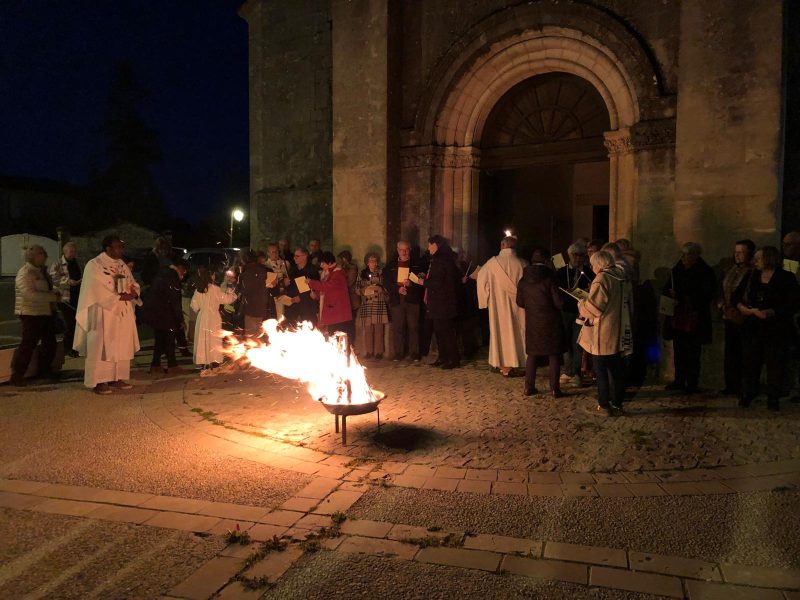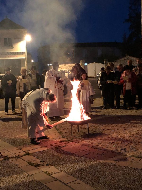 Victoire de la vie sur la mort et arrivée de la lumière dans le monde, le ‘ feu nouveau ‘ a été allumé cette année sur le parvis de l’église de Jarnac-Champagne