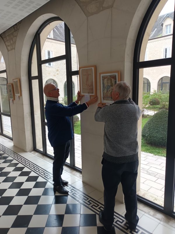 Exposition d’images pieuses dans le cloître de la Maison diocésaine à Saintes en février 2026