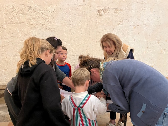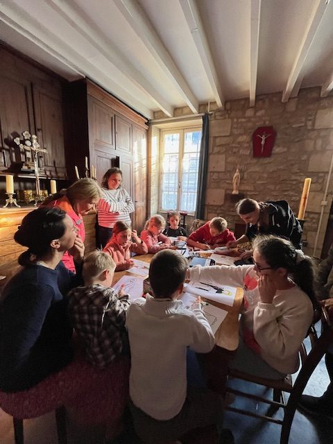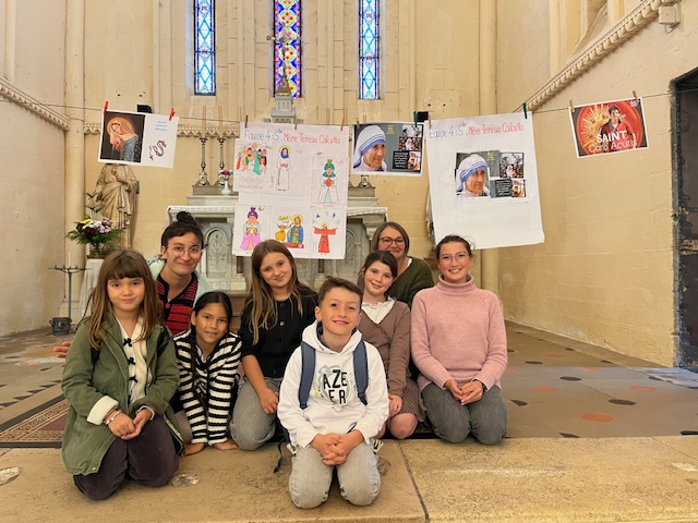 Puis, nous avons réparti les enfants en 4 équipes pour participer aux jeux dans l’église. Chercher les images des saints et les coller sur l’affiche.