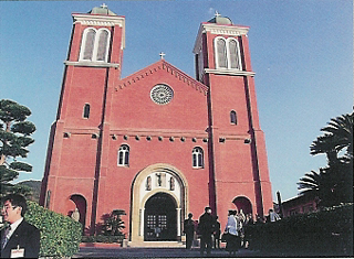 Eglise cathédrale d’Urakami actuelle, rebâtie 1945. Les statues de la Passion sculptées par le P. Fraineau peu de temps avant sa mort ont été replacées au dessus de la grande porte d’entrée.