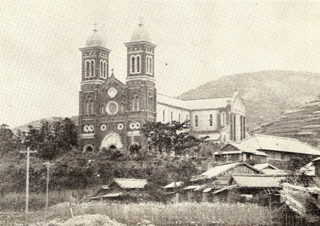 Eglise d’Urakami dont la construction fut commencée par le P. Fraineau en 1895, dont les deux tours furent bâties par le P.Heuzet en 1925 et détruite par la bombe atomique en 1945.