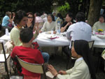 Ensuite, le père Pascal Delage recevait la délégation et les prêtres sous les arbres du presbytère pour un buffet préparé, dans la discrétion, par de nombreuses bonnes volontés et servi par une poignée de bénévoles. C’était le temps de se redire comment nos visiteurs nous avaient redonné le Père Fraineau et ô combien enrichis de ce bel exemple. On reste pantois devant la foi et le courage de ces jeunes hommes, débordant d’énergie, quittant leurs attaches pour se consacrer à la mission et ne plus revenir !