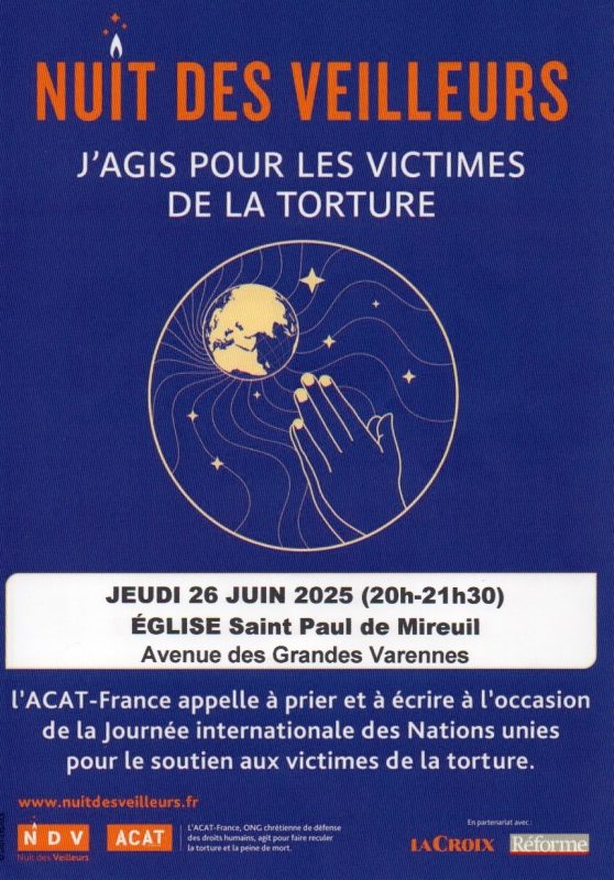Nous sommes heureux de vous présenter l’affiche de la soirée de prière, la Nuit des Veilleurs qui aura lieu le jeudi 26 juin de 20h à 21h heures 30 , à l’église saint Paul à Mireuil (face à la ludothèque 43, rue des Grandes Varennes).