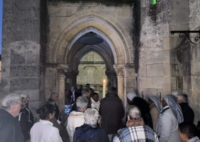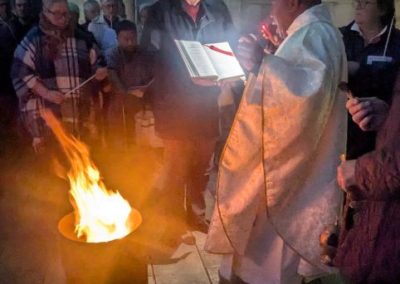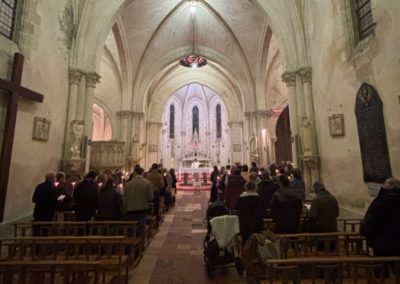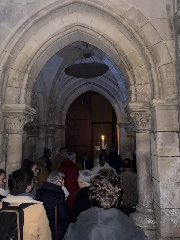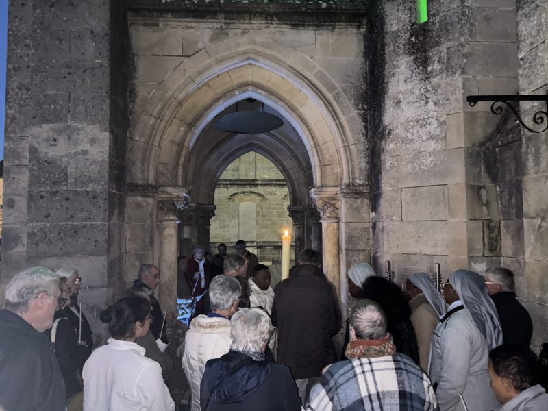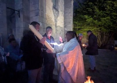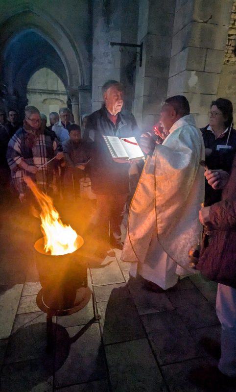 La célébration a débuté à l’extérieur, autour du feu nouveau. Après la bénédiction du Cierge Pascal, symbole du Christ « Lumière du monde », la procession s’est avancée solennellement dans l’église plongée dans l’obscurité. Au chant du Lumen Christi, la flamme s’est transmise de cierge en cierge, illuminant peu à peu les voûtes de pierre de l’édifice.
