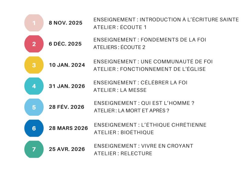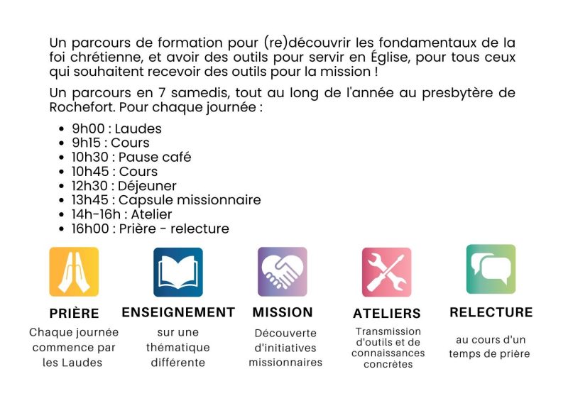 Public : Ce parcours s’adresse à tous les chrétiens désirant approfondir leur foi et recevoir des outils pour la mission : bénévoles œuvrant dans vos paroisses ou dans les services diocésains ; personnes préparant aux sacrements ou célébrant les funérailles ; membres d’équipes pastorales ; catéchistes ; sacristains ; responsables des servants d’autel ; secrétaires ; personnes de l’accueil ; fleuristes… sans oublier catéchumènes ou néophytes. La liste n’est pas exhaustive.