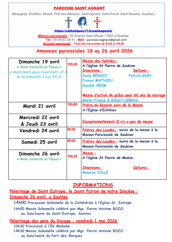 Annonces paroissiales 19 au 26 avril 2026
