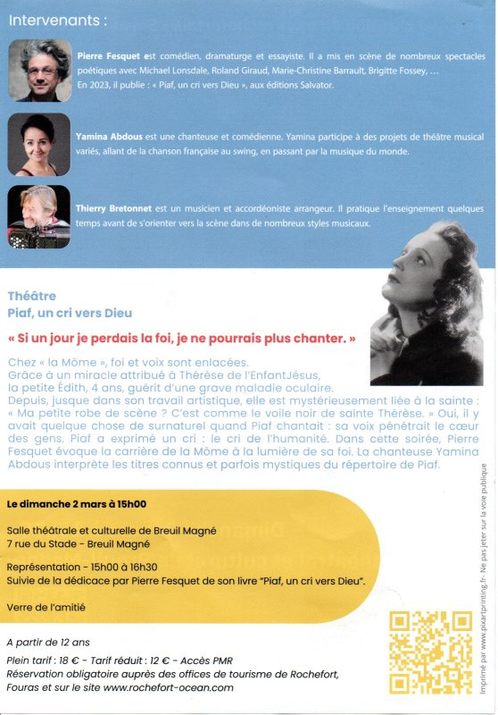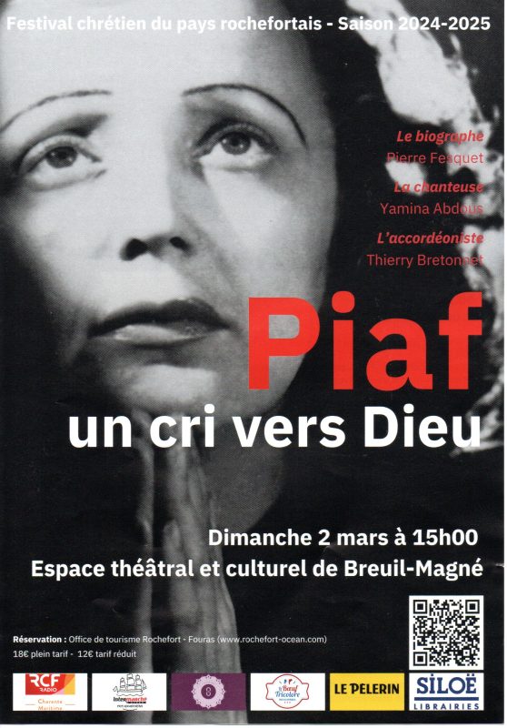 Le Festival chrétien du pays-rochefortais vous invite au théâtre ! Avec la magnifique pièce « Piaf, Un Cri vers Dieu ». La représentation unique aura lieu le dimanche 2 mars à partir de 15h00, à l’Espace Théâtral et Culturel de Breuil Magné équipé de fauteuils tout neuf !