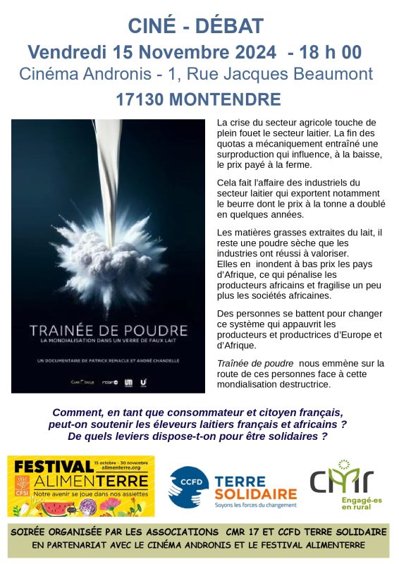Les associations CMR 17 et CCFD Terre Solidaire vous invitent à participer à la soirée Ciné-Débat qui aura lieu le vendredi 15 Novembre, à 18 h 00 au Cinéma Andronis (1, Rue Jacques Beaumont, 17130 MONTENDRE).