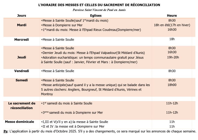 HORAIRES DES MESSES ET DU SACREMENT DE RÉCONCILIATION